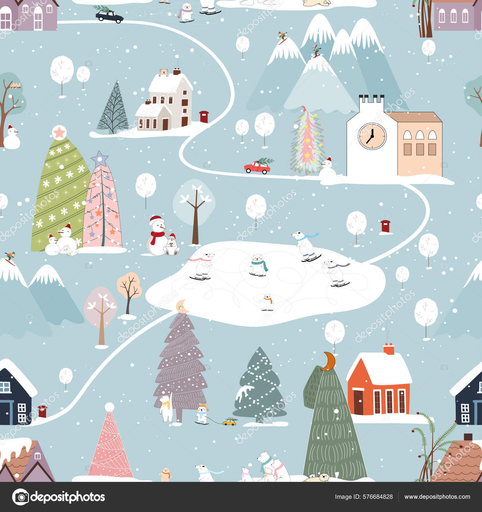 Vinter Sömlös Mönster Jul Landskap Staden Med Tall Saga Hus vektor